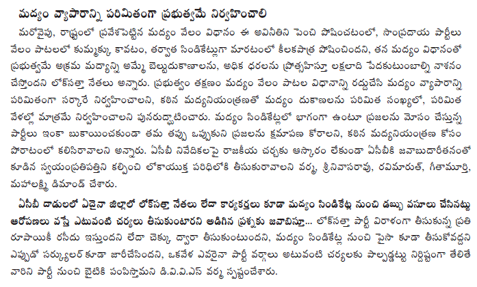 The Lok Satta Party spelt out its stand on the liquor scam unearthed by the Anti Corruption Bureau at a media conference. Mr. D. V. V. S. Varma, Lok Satta Party Working President, and party leaders Katari Srinivasa Rao, P. Ravi Maruth, K. Gita Murthy, and M. Mahalakshmi addressed the media.