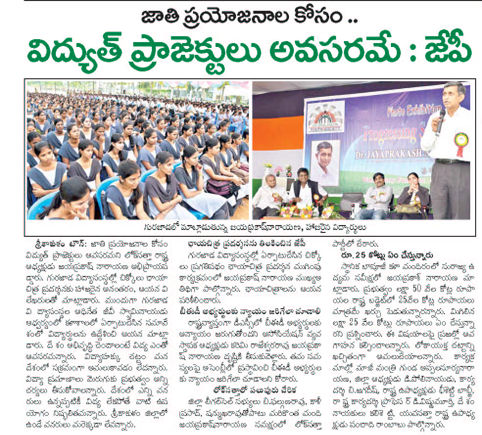 Lok Satta Party national President Dr. Jayaprakash Narayan will be addressing students of the Gurajada group of educational institutions in Srikakulam on Tuesday, December 11.