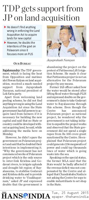 We need a sense of urgency and purpose to overcome our failings. Democracy cannot be an alibi for failure. This is the time to resolve to reengineer our instruments of state to make them a vibrant machine to take us to our destination. Our people deserve better lives; our children deserve greater opportunity, our nation deserves a pride of place in the world. It is time empty rhetoric and shibboleths give way to resolute action. It is never too late. If we now act, by 2022, when we complete 75 years of freedom, India can overcome all our shortcomings and march ahead unhindered. Let us aim at that goal and transform India. That is the only ambition worthy of our great national movement and our glorious civilisation." - Dr Jayaprakash Narayan, Lok Satta founder